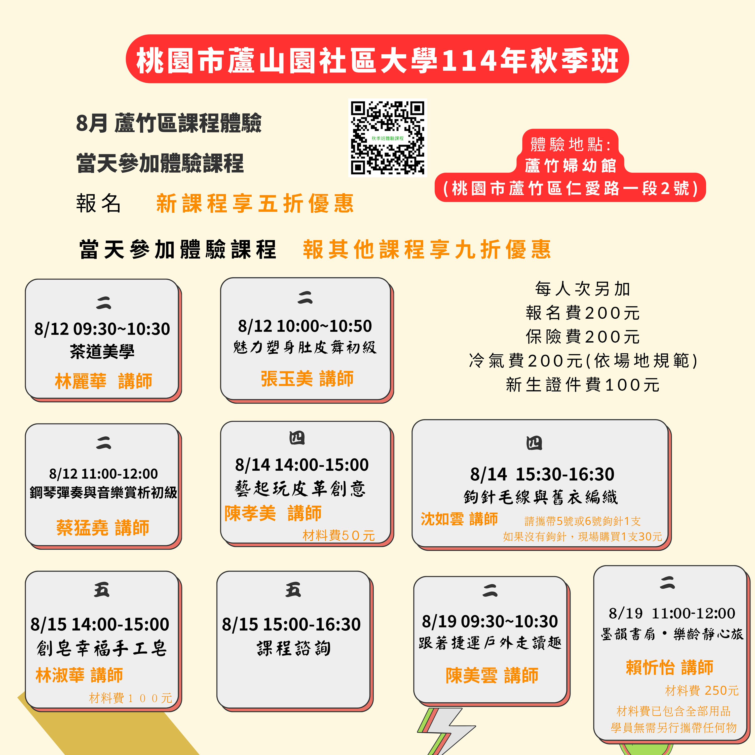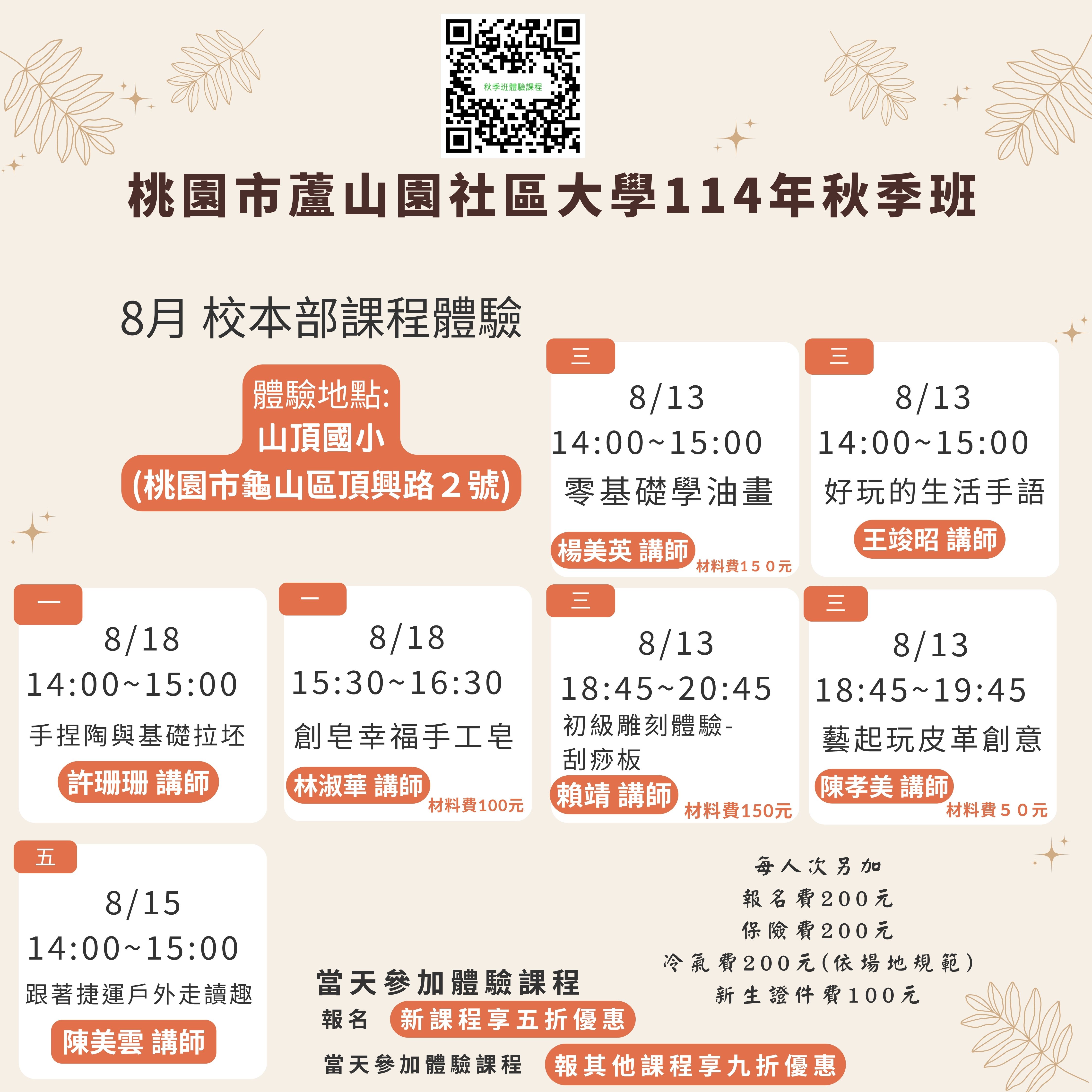 補充:體驗課程新增 8/20日(週三) 下午 13:30-14:30 竹笛演奏與賞析─龜山區山頂國小