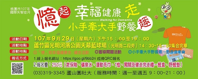 活動資訊 指導單位:桃園市政府、桃園市政府社會局 主辦單位:社團法人桃園市濟世功德協進會 活動日期:107 年09月29 日(星期六)下午15:00〜19:00 報名日期:即日起至107年9月27日(星期四)PM23:50截止 報名費用:250元 報名限額:500人,不限參加對象 活動地點:蘆竹區光明河濱公園(光明路二段旁) 健走里程:約1.5公里 集合地點:活動當天請逕自活動會場報到處簽名報到,14:30~14:50舞台區集合